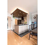 キッチン部分の下がり天井を活かし、美しく仕上げるためにパナソニックの羽目板を活用。さらにダウンライト照明をあしらうことで、スタイリッシュな大人のキッチン空間が完成しました。