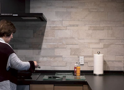 入居時からお気に召さなかったというキッチンの吊戸棚を取り払い、空間が開放的に。イタリア製の凹凸のある壁材が、やはり凹凸のある玄昌ブラックのキッチンカウンターとよくマッチし、ハイセンスなキッチンリフォームに仕上がりました。ダウンライト照明や羽目板上の間接照明がリビングの雰囲気まで一変させ、上質な大人の暮らしを演出します。