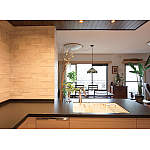 キッチン部分の下がり天井を活かし、美しく仕上げるためにパナソニックの羽目板を活用。さらにダウンライト照明をあしらうことで、スタイリッシュな大人のキッチン空間が完成しました。