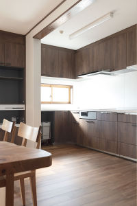 木の質感がお好きなS様。以前からケヤキの無垢材のダイニングテーブルを愛用されているため、床材もキッチンの扉カラーもテーブルに合う色味を選びました。“家族でテーブルを囲んで食事をする場ですので、とにかく落ち着く空間にしたかったそう。