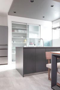 ダークグレーの扉が高級感を醸し出すキッチンは、収納もたっぷり。引出しごとにお鍋や調理器具から保存容器まで、定位置を決めてしまえます。キッチン背面の造り付け収納には、食器やストック品のほか、ごみ箱まですっきり納まりました。