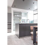ダークグレーの扉が高級感を醸し出すキッチンは、収納もたっぷり。引出しごとにお鍋や調理器具から保存容器まで、定位置を決めてしまえます。キッチン背面の造り付け収納には、食器やストック品のほか、ごみ箱まですっきり納まりました。