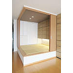 お布団のサイズを考慮して極力圧迫感が出ないよう計画した畳小上がり空間。L字に開くので普段は開放的に。取合収納は、お布団とご主人様のお洋服収納を計画。