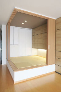 お布団のサイズを考慮して極力圧迫感が出ないよう計画した畳小上がり空間。L字に開くので普段は開放的に。取合収納は、お布団とご主人様のお洋服収納を計画。