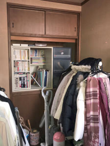 2階和室を通って奥にある納戸の一部に作り付けられた本棚は奥行が深く、また上部・下部のスペースは取り出しにくかった。
