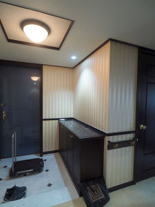 シーリングライトが少し威圧感がある。玄関収納の天板も石だと雰囲気に合わない。