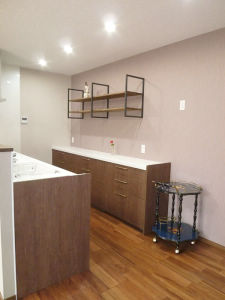 家具の雰囲気を壊さないような扉材を選択され奥行の深いカップボードをベースにしてアイアンシェルフで装飾と実用性を得られるようにした。
