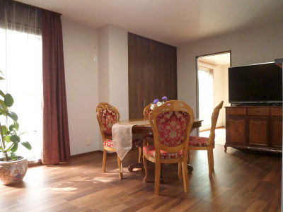 クラフトレーベルの扉と床材がお手持ちの家具とも調和してハイクラスなイメージとなった。椅子はお客様によって専門の張替え業者に依頼して新品のようになって戻ってきた。こちらもご主人との思い出が多く大切にというお気持ちだと思う。