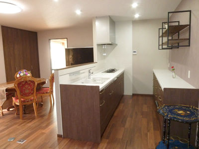 キッチンを対面に配した事でダイニングスペースと区切りが出来て家具もレイアウトし易くなった。