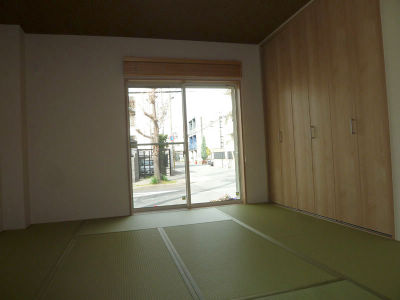 リビングからは3枚引戸で間仕切ることが出来開放すると床段差無く広い空間になる。こちらは寝室となる。