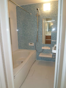 1616のオフローラを新設 広く明るく清潔感のある浴室になり、床段差もなく入りやすい。