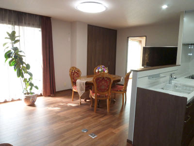 ご家族のプライベート空間として店舗部分を改装。応接間や個室は他のスペースにあるので今回同居される娘様世帯のファミリー空間の充実がメインのリフォームとなった。また既存キッチンはお母さまと一緒に使い食事も一緒にされるので、ハイグレードで機能的な仕様とした。