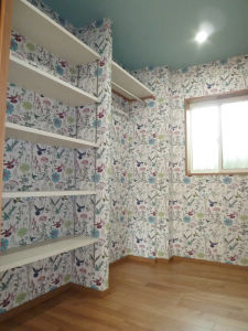 クロスもブルーの天井にイエローの柄の壁クロスを採用し暗くなりがちな空間を楽しく演出。既存カップボードもこちらに納まった。