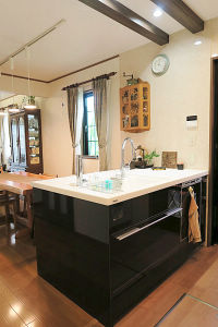 シンク側キッチンと同色の木目シートを貼った梁がアクセントに。キッチン本体の収納量がアップしたので、溢れていた物もスッキリ納まりました。お隣の視線が気になるキッチン窓は塞いでも、LDからの光で明るい空間に。