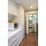 キッチンに充分な調理スペースとレンジ置き場を考慮したので、奥のパントリーまでの通路をゆったり確保。洗濯機を移動してできた奥のお部屋は、パントリー兼ちょっとした作業スペースに。