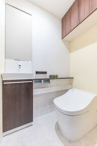 手洗いカウンターはインテリア性を重視して木目柄をご選択。トイレは自動水栓にしたことで、清潔の保持はもちろんコロナ感染防止対策にもなり、来客時にも安心してご使用して頂ける。