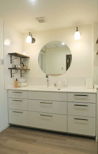 ユーティリティは洗濯機置き場のみで、洗面室との間仕切り戸は開けっ放しで利用されていなかったので、間仕切り壁を取り払い広々とした1室にしました。ラシスのフロアキャビネットの収納が充実しているので、トール収納はなくして、W1650のワイドな洗面化粧台に。元々広い洗面室でしたが、間仕切り壁を取り払うことでよりゆとりある空間が確保でき、ワイドな洗面台とサークルミラーがホテルライクな空間を演出し、おしゃれな洗面室に仕上がりました。洗濯機上のフレームシェルフと同じ棚板を使って、洗面横にもアイアンアングル固定棚を取り付け、ブラケット照明と共に、空間の良いアクセントとなりました。