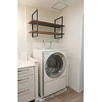 よく使用するものや仮置き棚として、洗濯機上にフレームシェルフを採用。洗面台や洗濯機の上に物を置いて乱雑になるのを防ぐ効果も。