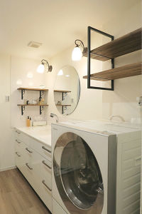 よく使用するものや仮置き棚として、洗濯機上にフレームシェルフを採用。洗面台や洗濯機の上に物を置いて乱雑になるのを防ぐ効果も。