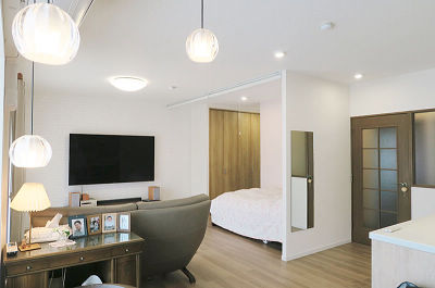 納戸と化していた和室を取り込み、広々としたLDKへ。ダイニングからでも見応え充分な大画面壁掛けTVが映える空間に。ベッド側には普段使いのクローゼットと、お仏壇スペースを確保。