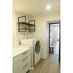 洗濯機上のフレームシェルフと、同じ棚板で作ったアイアンアングル固定棚とブラケット照明が、ホワイトで統一した洗面台や洗濯機の中でアクセントになり、おしゃれな洗面室になりました。