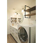 洗濯機上のフレームシェルフと、同じ棚板で作ったアイアンアングル固定棚とブラケット照明が、ホワイトで統一した洗面台や洗濯機の中でアクセントになり、おしゃれな洗面室になりました。