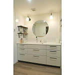 ユーティリティは洗濯機置き場のみで、洗面室との間仕切り戸は開けっ放しで利用されていなかったので、間仕切り壁を取り払い広々とした1室にしました。ラシスのフロアキャビネットの収納が充実しているので、トール収納はなくして、W1650のワイドな洗面化粧台に。元々広い洗面室でしたが、間仕切り壁を取り払うことでよりゆとりある空間が確保でき、ワイドな洗面台とサークルミラーがホテルライクな空間を演出し、おしゃれな洗面室に仕上がりました。洗濯機上のフレームシェルフと同じ棚板を使って、洗面横にもアイアンアングル固定棚を取り付け、ブラケット照明と共に、空間の良いアクセントとなりました。