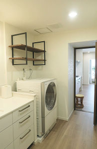 よく使用するものや仮置き棚として、洗濯機上にフレームシェルフを採用。洗面台や洗濯機の上に物を置いて乱雑になるのを防ぐ効果も。