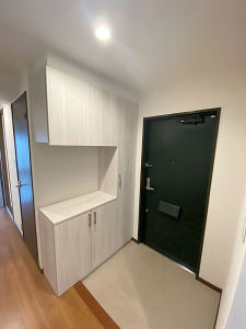 既存収納は老朽化していたのと収納力もなかったので玄関コンポリアを新設した。照明もLEDに変えて明るい玄関を作った。