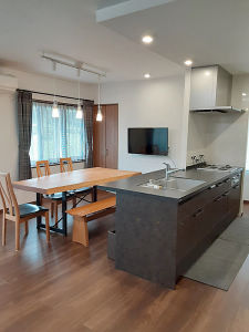 床のエイジドチークとブラックのグラリオカウンタ―扉のビンテージブラウンがかっこいい奥様にぴったりなLDKになりました。