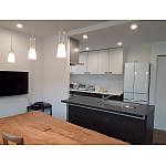 キッチン間仕切りを撤去した部分は天井の高さが少し違った為敢えて少し下げて広い空間のキッチンエリアの区切りのようなイメージを持たせた。キッチンが見えても生活感のないLDKになった。