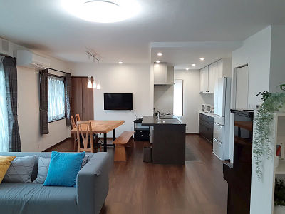 一部屋を取り込んでスペースを広げても、キッチンを移動して窓を塞いで背にした対面にするのはあまり広く感じないと思い、現状の位置で壁を撤去し、使い易い通路を確保するために少しキッチンを前に移動させた。フラット対面ですっきりとさせカップボードも色味を統一し、吊り戸はホワイトで広く感じるように提案。各個室は少し縮小して大きなウォークインクローゼットを新設する事で使い易くしまいっぱなしにならないように奥様のご希望に沿って内部を造作した。