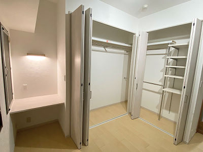 2つの洋室を繋げ、大容量のクローゼットとデスクを設け、快適な奥様の部屋にした。ロケーションも良く、快適。