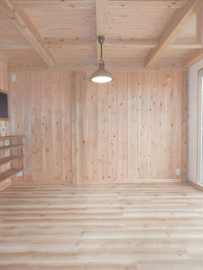 洋室の子供部屋は、本を効率よく収納できるように可動式の造作棚を多数、設置しました。壁の一面に、北欧風カントリー調の無垢羽目板の杉板を施工しました。