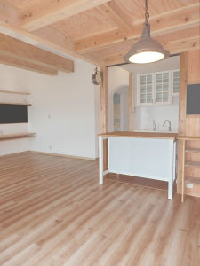 リビングダイニングと和室から、開放的で広々とした、優しい雰囲気のリビングダイニングに変更しました。リビングダイニングの正面の壁には、薄型液晶テレビを設置しました。