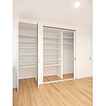 リビングダイニングの壁面に設けた部屋の端から端までのクローゼット収納です。収納の用途に合わせて、上下に可動できる棚板をバランスよく配置しました。