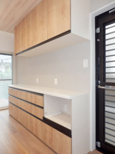 キッチンレイアウトの変更にともない、キッチンの背面にカップボードを設置しました。キッチン本体との間のスペースを1mにして、2人同時に家事ができるよう動線に配慮しました。