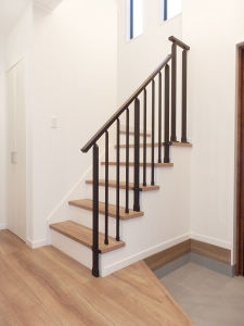 すっきりとした縦のラインが印象的なオープン型のアイアン手すりに変更しました。 踏板の茶色と蹴込板の白色、手すりの黒色が洗練されたモダン空間を演出しています。