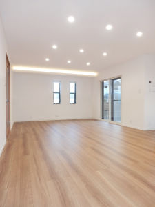 広々とした20帖のリビングダイニングです。リビングダイニングの壁の一面に、端から端までの間口の広い使い勝手の良い収納を設けることで、部屋が片付きやすく広く使う事ができます。
