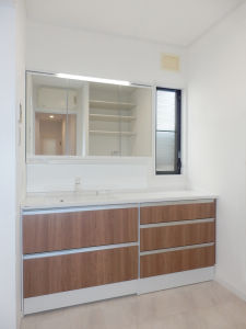 洗面化粧台は、パナソニックのシーラインです。窓からの採光や通風を確保し、洗面所スペースの全幅を有効に使い、壁から壁まで隙間なくカウンターと収納を設置しました。
