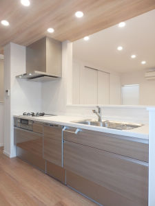 キッチンで家事をしながらリビングダイニングを眺めることができるように、対面式のオープンキッチンに変更しました。キッチンの上部に吊戸棚を設けずオープンにする事で、一体感を高めることができます。
