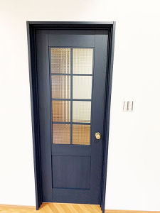 ご主人様の拘りチェッカー熱処理ガラス、内装扉 クラフトレーベル。床のヘリンボーン柄とマッチしています。