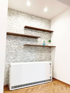 お部屋のデッドスペースを蓄熱暖房機の設置場所だけでなく殺風景にならないよう飾り棚でアクセント、ご主人様がお選びされたクロスがマッチしモダンに。