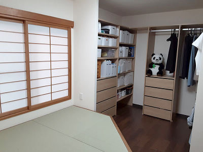 『畳が丘』を設置。たっぷり入る収納には、ご家族の思い出の品、お子様の成長の記録を収納。南西角で、窓を開けると風通しが良く、冬は日が入り暖かく気持ちの良い空間になりました。