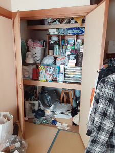 収納についてご相談を受け訪問。2階には収納スペースが多いのですが、生活の中心となる1階には、和室の押入れしか収納がなく、水廻りで使用する洗剤類や、トイレットペーパー等の消耗品等を和室押入にいれておられましたが、奥行きが深く使い勝手くご不便そうな印象でした。