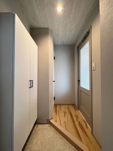 狭小空間のお玄関にフロートトールタイプの玄関収納を設置、框も斜めに切ることで靴を脱ぐスペースを設けトイレスペースまで確保。必要なものがギュッと詰まったスペースです。