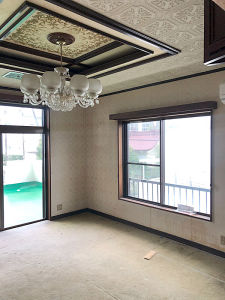 大きなお家なので部屋を広くする事はかんたんですが、単調にならないように天井・照明・壁紙で変化をつけてみました。