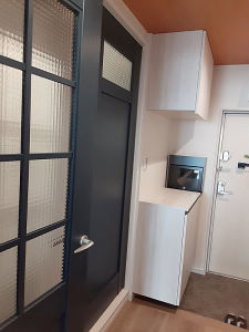 リビングドアは採光タイプのもので光を玄関ホールまで取り込む事が出来左壁側には天井までの収納を新設してスッキリ片付いた雰囲気になった。