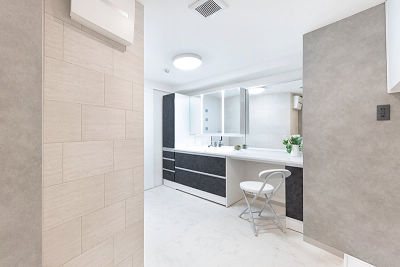 広くなった洗面室にはカウンタータイプの洗面化粧台を設置。お手持ちの椅子に座って、快適にメイクやスキンケアを楽しむことができます。まるでリゾートにいるかのような贅沢な空間です。
