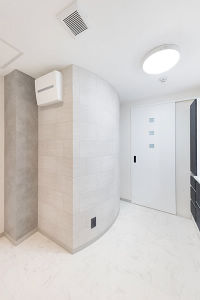 トイレとの間仕切り壁にアール壁を採用しました。またパイプスペース(PS)の壁の存在感を差し色使いで緩和しました。リゾートホテルのような水廻り空間が実現しました!